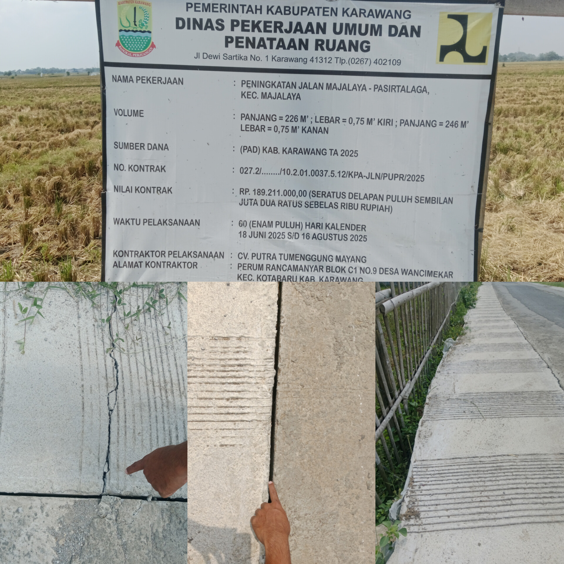 “Realisasi proyek anggaran Pendapatan Asli Daerah (PAD) Tahun Anggaran 2025 Kabupaten Karawang yang dikerjakan oleh pelaksana CV. Putra Tumenggung Mayang dengan Nilai kontrak RP. 189.211.000.00 (Seratus Delapan Puluh Sembilan Juta Dua Ratus Sebelas Ribu Rupiah) Baru beberapa bulan selesai, jalannya sudah retak-retak. Ini jelas ada yang tidak beres,” ujarnya.