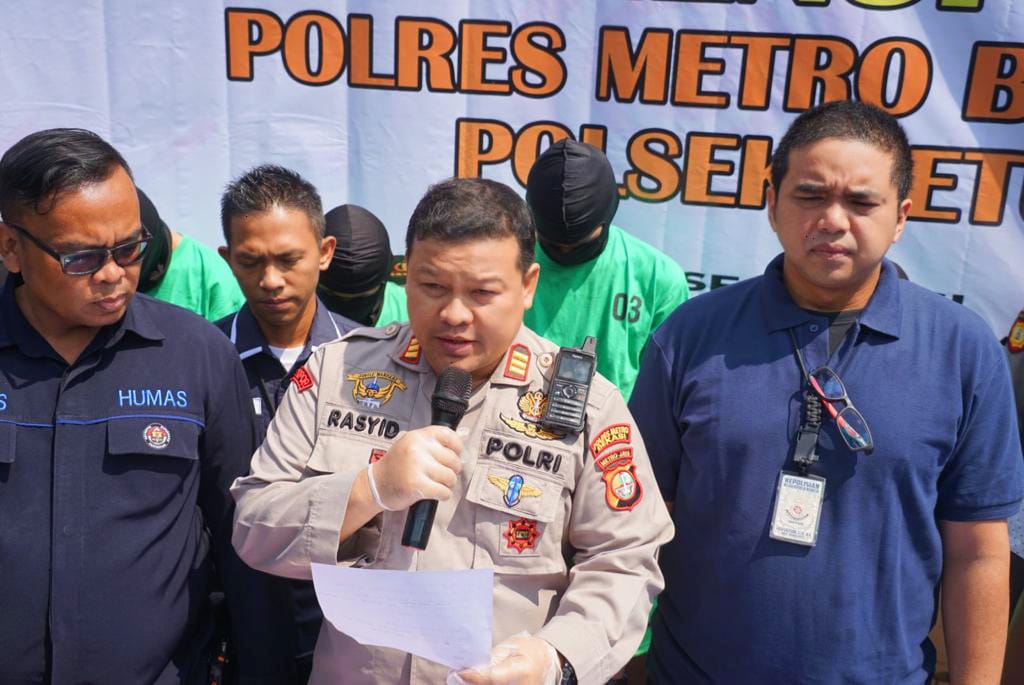 “Empat tersangka tersebut adalah I.B, DA, TA dan TVH,” ujar Kapolsek Setu AKP Abdul Rosyid yang didampingi Kasat Reskrim Kompol Gogo dan Kasi Humas Polres Metro Bekasi AKP Hotma Sitompul saat Press Release di halaman Mapolsek, pada Kamis (10/08/2023).