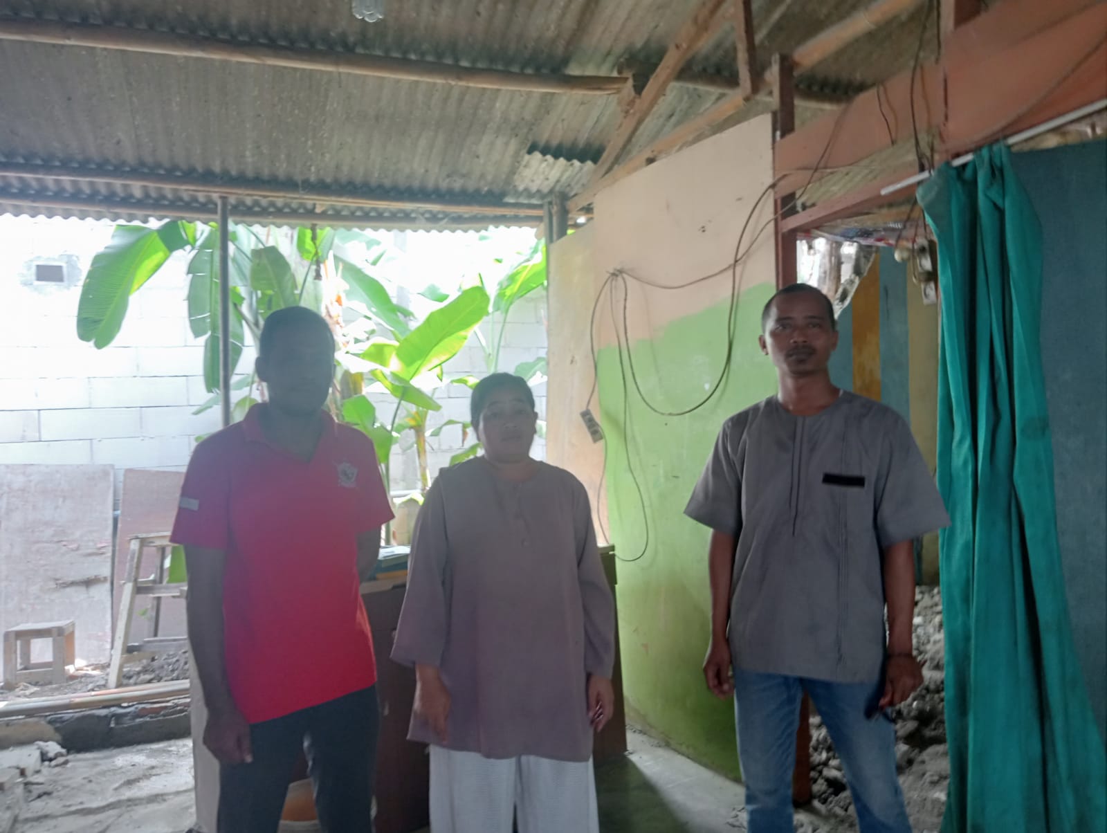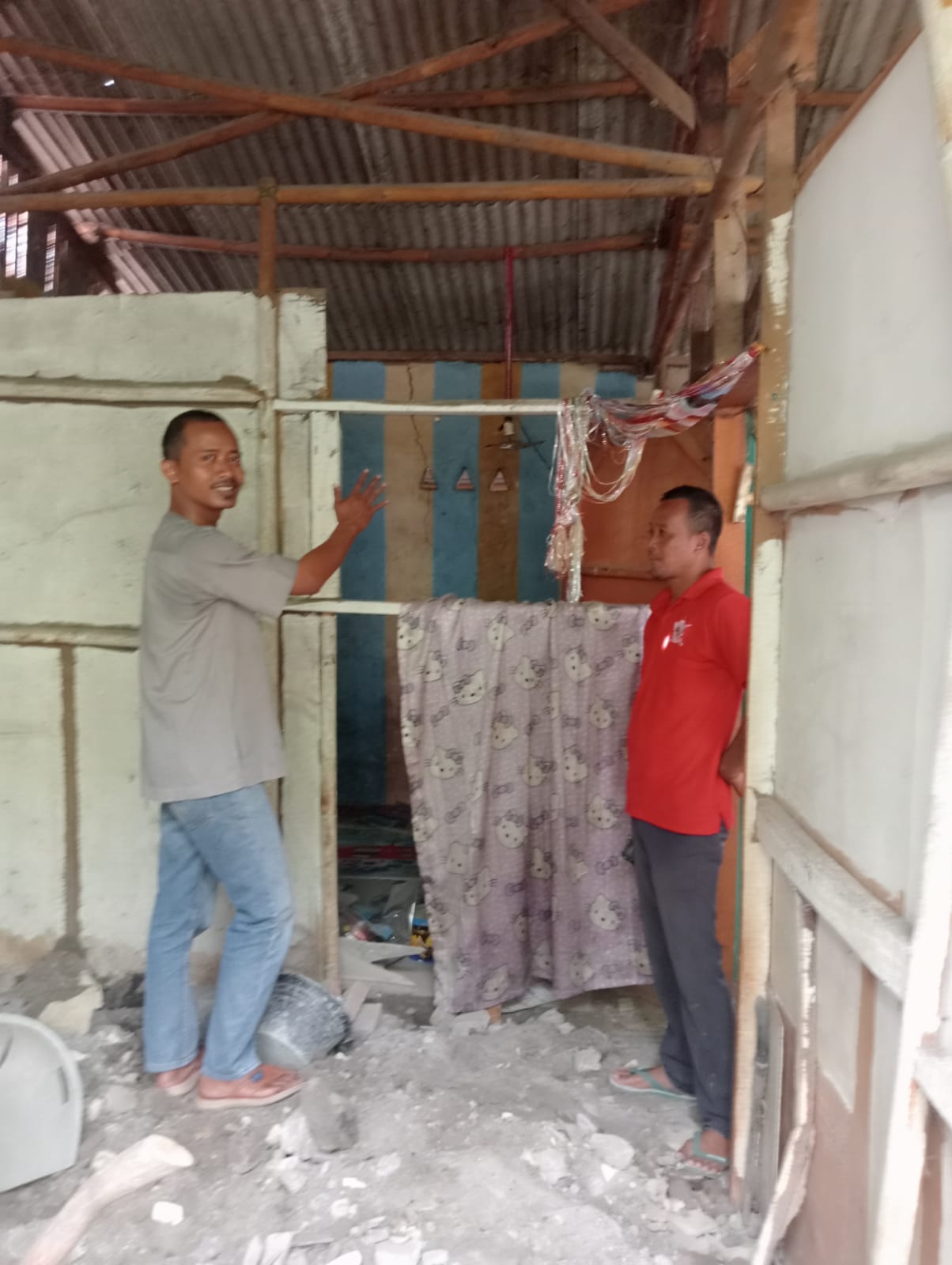 “Semalam pas angin kenceng saya lagi pada tiduran sama anak anak , tiba tiba tembok saya ambruk dan menimpa lemari alhamulilahnya kaga nimpa anak anak ” ucapnya dengan nada sedih.