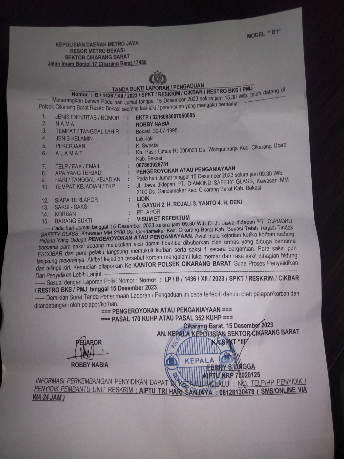 Laporan pun diterima dengan Surat Tanda Bukti Laporan/Pengaduan Polisi Nomor : LP/B/1436/XII/2023/SPKT/RESKRIM/CIKBAR/RESTRO BKS/PMJ, tanggal 15 Desember 2023, guna proses penyelidikan dan penyidikan lebih lanjut.