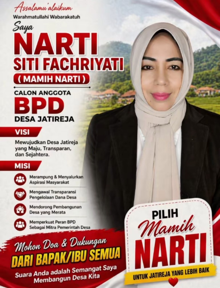 Dengan mengusung visi “Mewujudkan Desa Jatireja yang Maju, Transparan, dan Sejahtera”, Mamih Narti berkomitmen untuk menjadi jembatan aspirasi masyarakat sekaligus pengawal jalannya pemerintahan desa agar lebih terbuka dan berpihak kepada kepentingan warga.