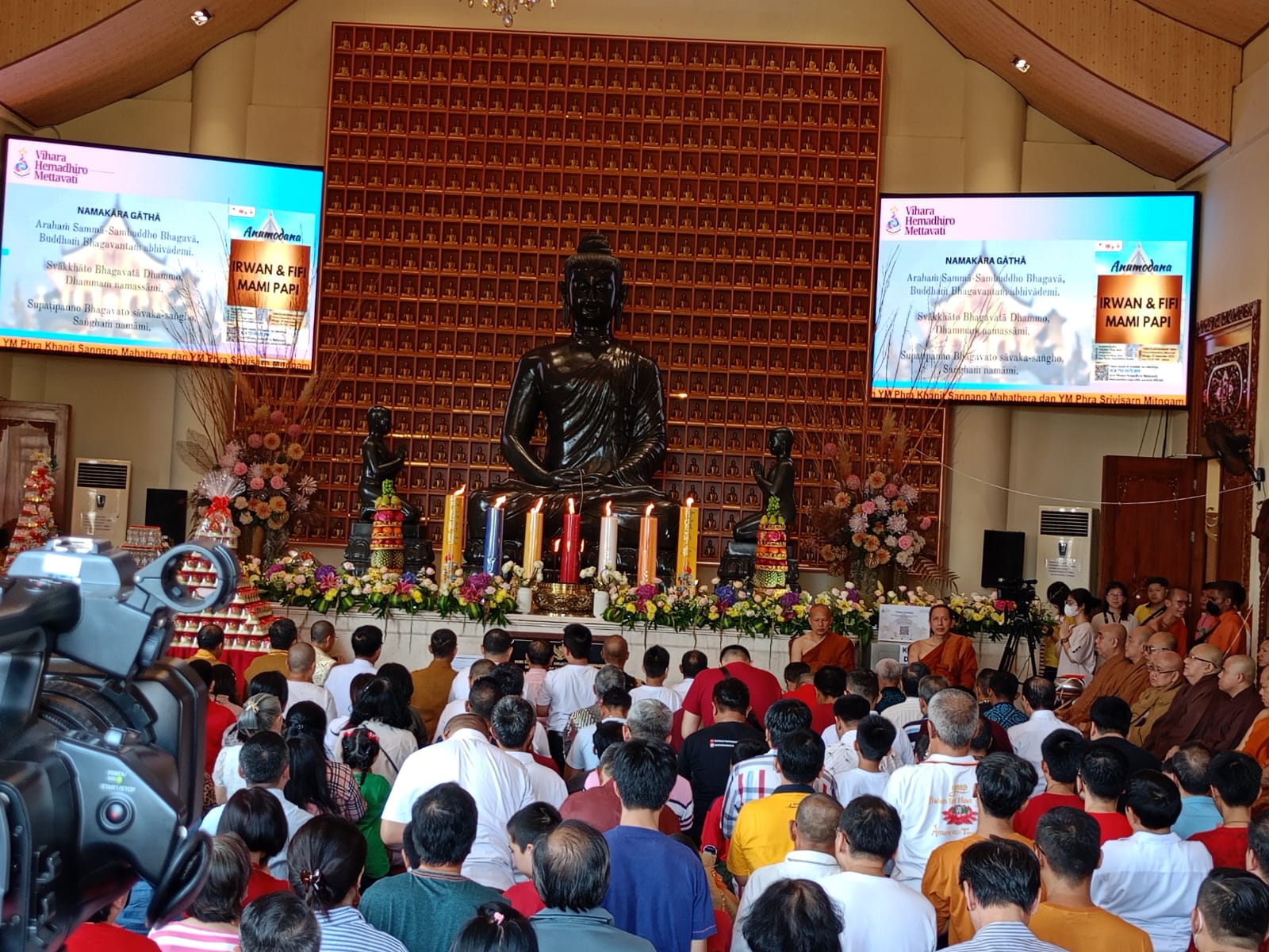 “Pada hari ini tanggal 15 September tahun 2024 kami dari Yayasan Vihara Hemadhiro Mettavati merayakan hari ulang tahun guru kami tercinta, Yang Mulia Phra Khanit Sannano Mahathera dan Yang Mulia Phra Srivisarn Mitngam Mahathera ke yang 56,” ujar Romo Asun Gotama selaku Ketua Yayasan Vihara Hemadhiro Mettavati kepada awak media.